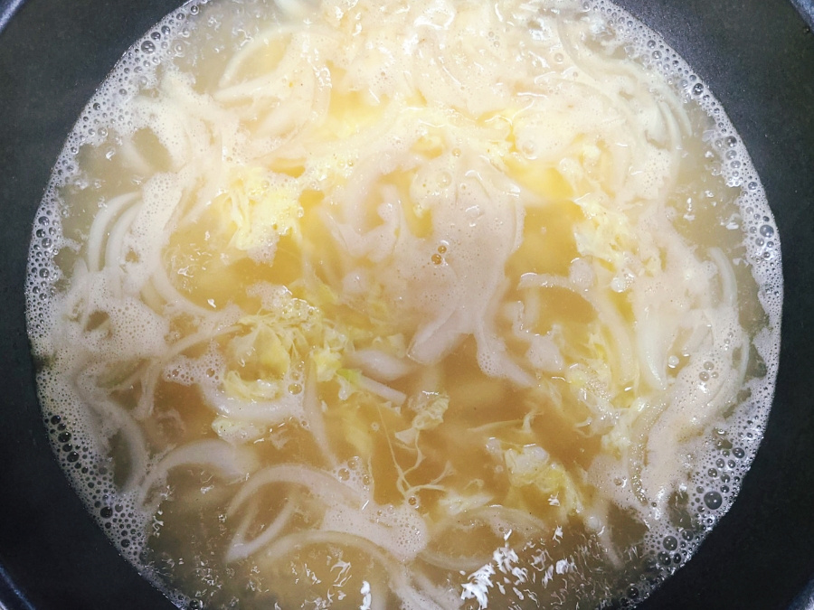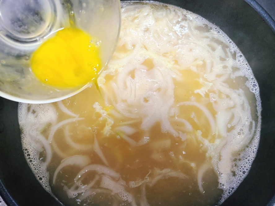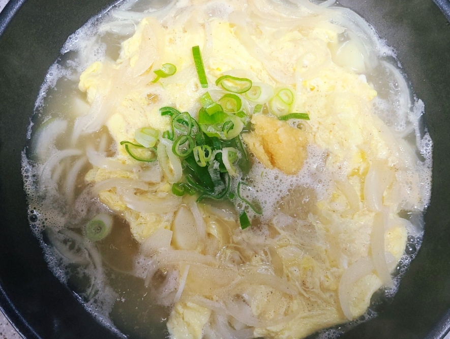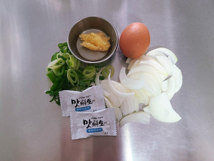 계란 1 개 , 소금 1 꼬집 정도 , 중간 크기 감자 2개 손질 후 220 g , 양파 100 g , 대파 15 g , 다진마늘 0.8 큰술 (밥 숟가락계량), 들기름 1 큰술 (밥 숟가락계량), 까나리액젓 1 큰술 (밥 숟가락계량), 참치액 0.5 큰술 (밥 숟가락계량), 후춧가루 톡톡톡 , 물 800 ~900 ml , 동전육수 2 개