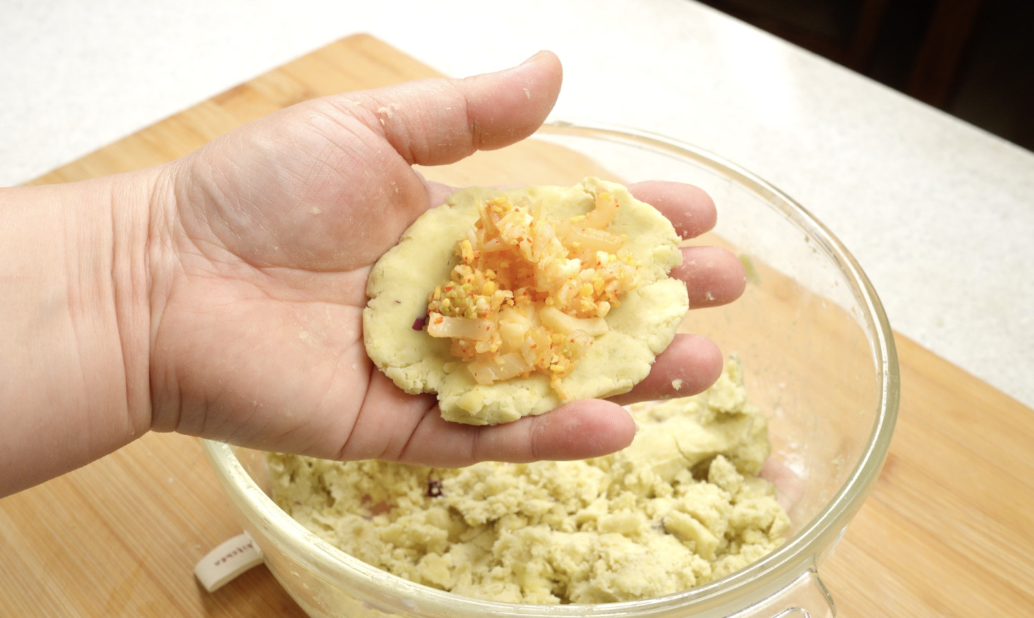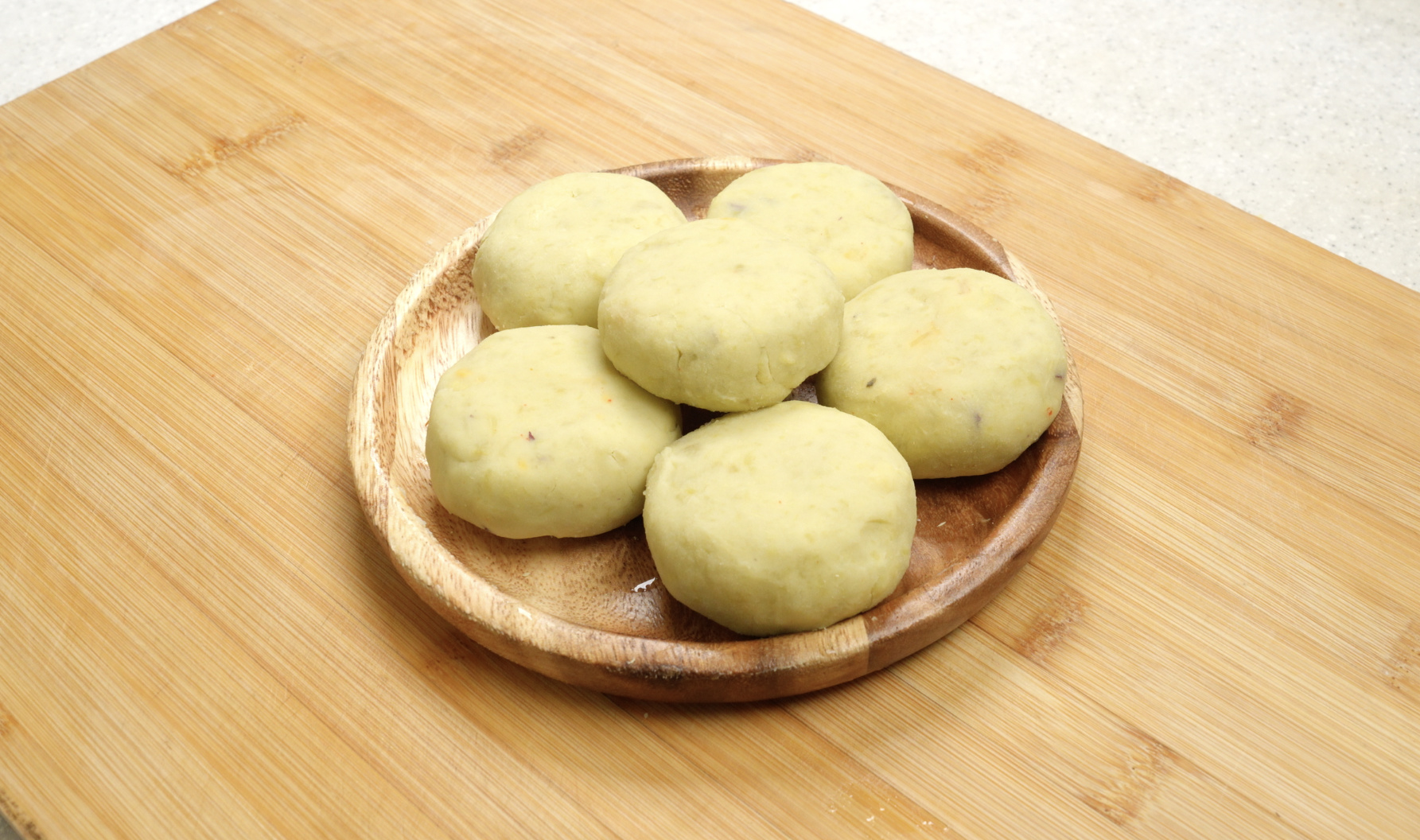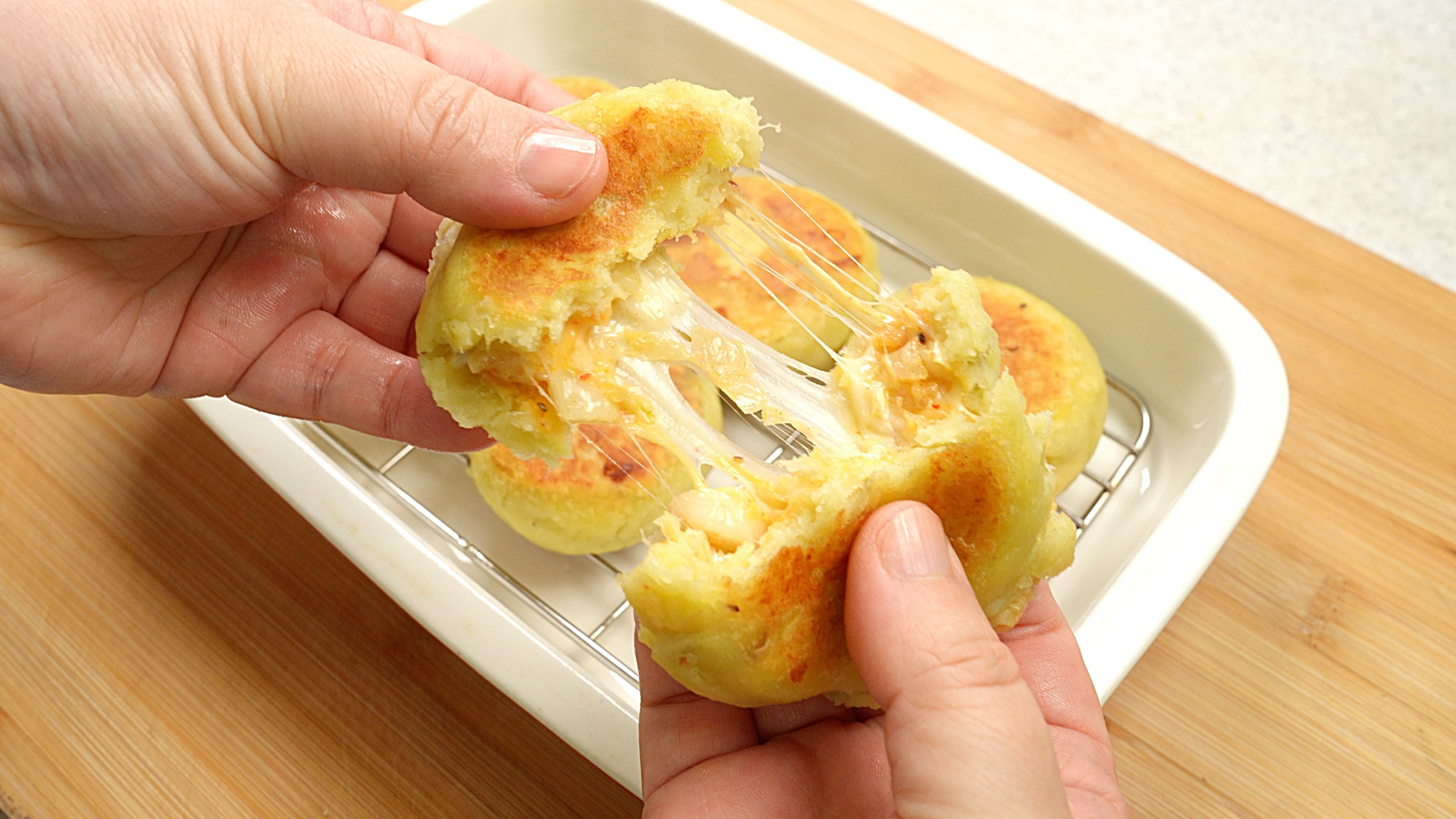 고구마 1 개 (350g), 김치 3 줄기 , 모짜렐라치즈 1/2 컵 , 전분가루 3 큰술 , 따뜻한 물 3~4 작은술 , 소금 2~3 꼬집 , 후추 2~3 꼬집 , 식용유 적당히
