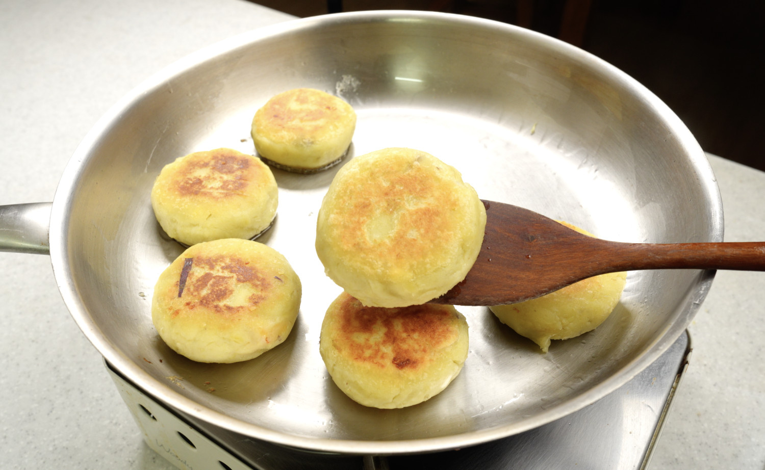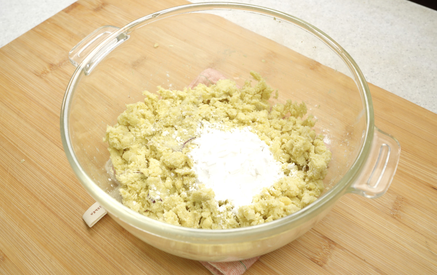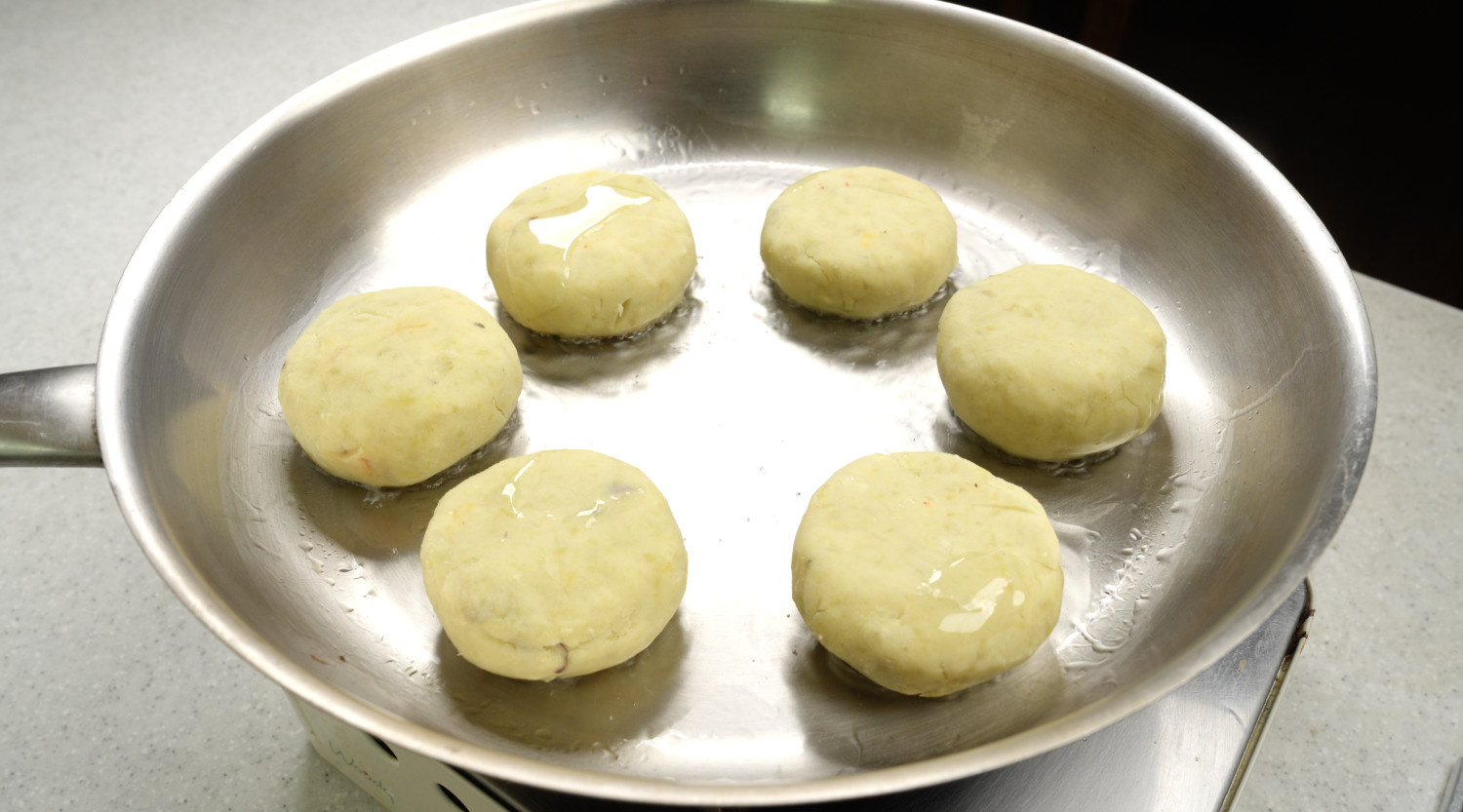 고구마 1 개 (350g), 김치 3 줄기 , 모짜렐라치즈 1/2 컵 , 전분가루 3 큰술 , 따뜻한 물 3~4 작은술 , 소금 2~3 꼬집 , 후추 2~3 꼬집 , 식용유 적당히