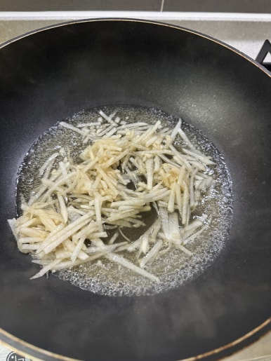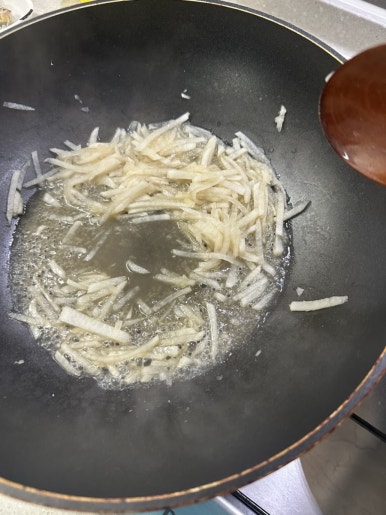 팬을 먼저 달궈주고, 준비해둔 무를 올려 중약불에서 서서히 볶아줍니다.