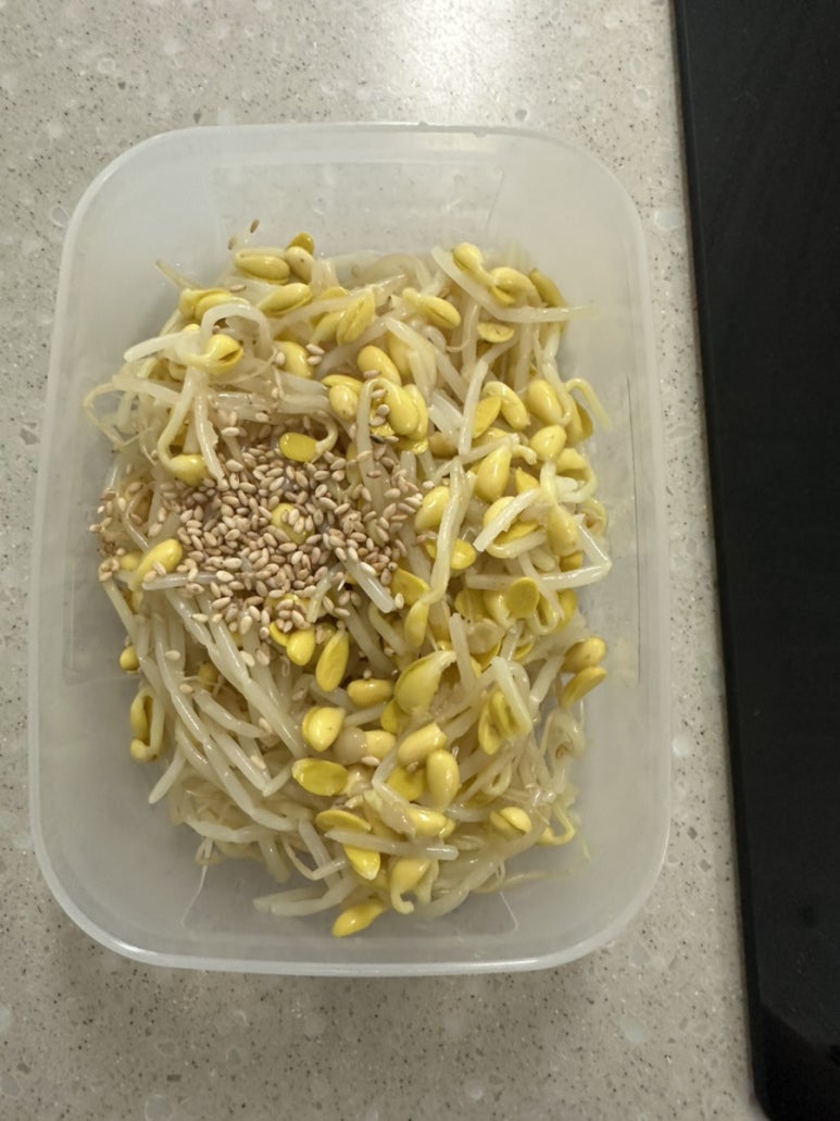 물을 제거한 콩나물에 간 마늘 1T를 넣어 부드럽게 섞어줍니다.