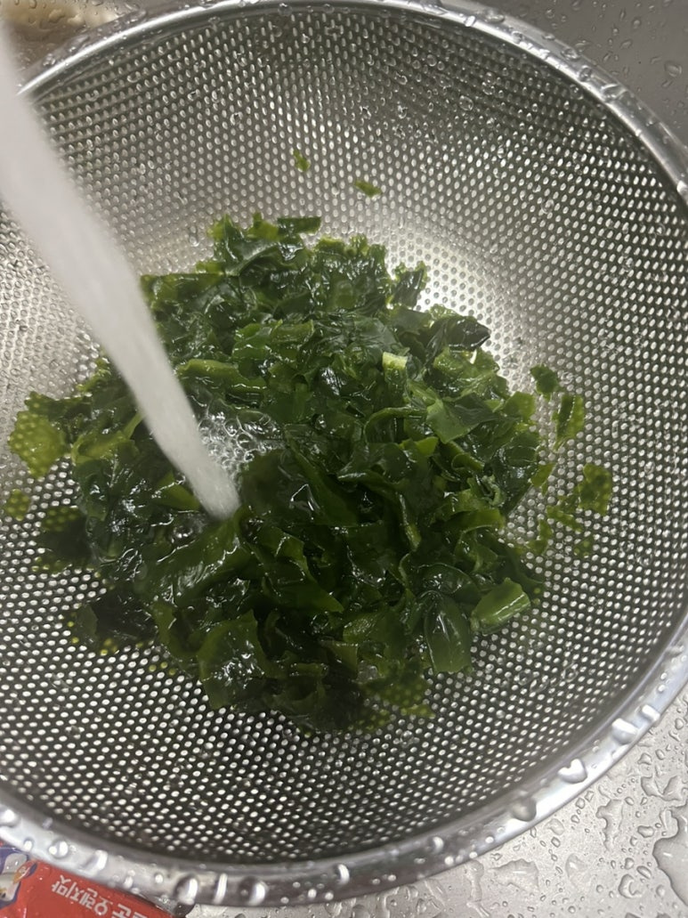 불린 미역은 물을 여러 번 갈아주며 깨끗하게 헹궈주세요. 채반에 담아 흐르는 물에 씻어 염분을 최소화하면 아기에게 부담 없이 먹일 수 있습니다.