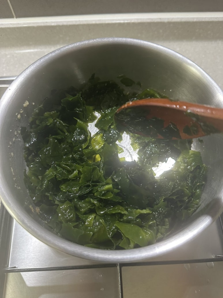 이때 다진 마늘 반 스푼을 넣어 마늘 향이 올라올 때까지 볶아주면 국물이 훨씬 깊고 고소해져요. 미역이 참기름과 잘 어우러질 때까지 볶아주는 게 중요합니다.