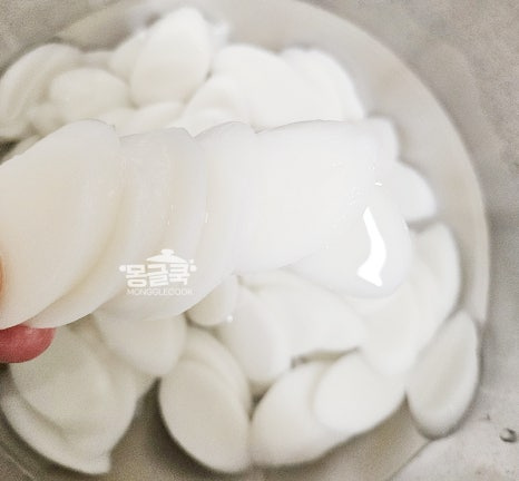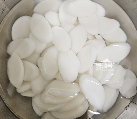 떡국떡은 찬물에 여러 번 헹궈 서로 붙은 부분을 떼어내고,