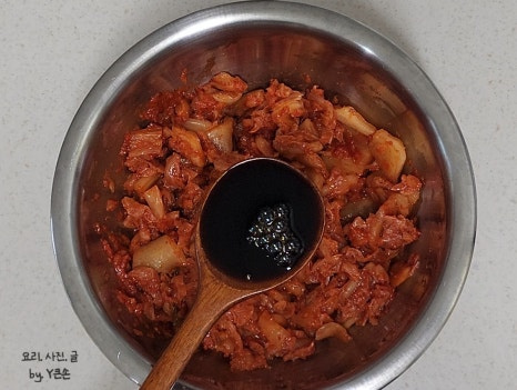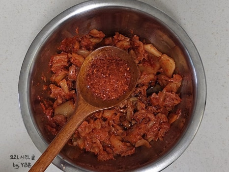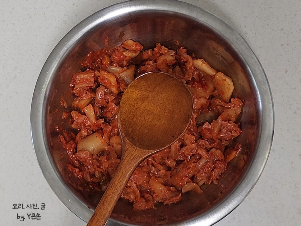 신김치가 아닐 때 식초를 넣어주시면 묵은지 맛을 느낄 수 있습니다. 묵은지라 신맛을 중화시키려면 설탕 0.5T 정도 넣어주세요.