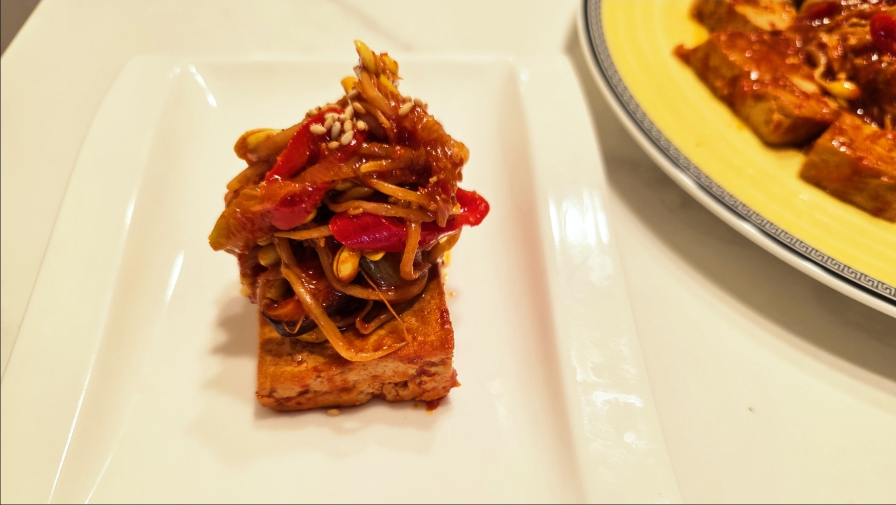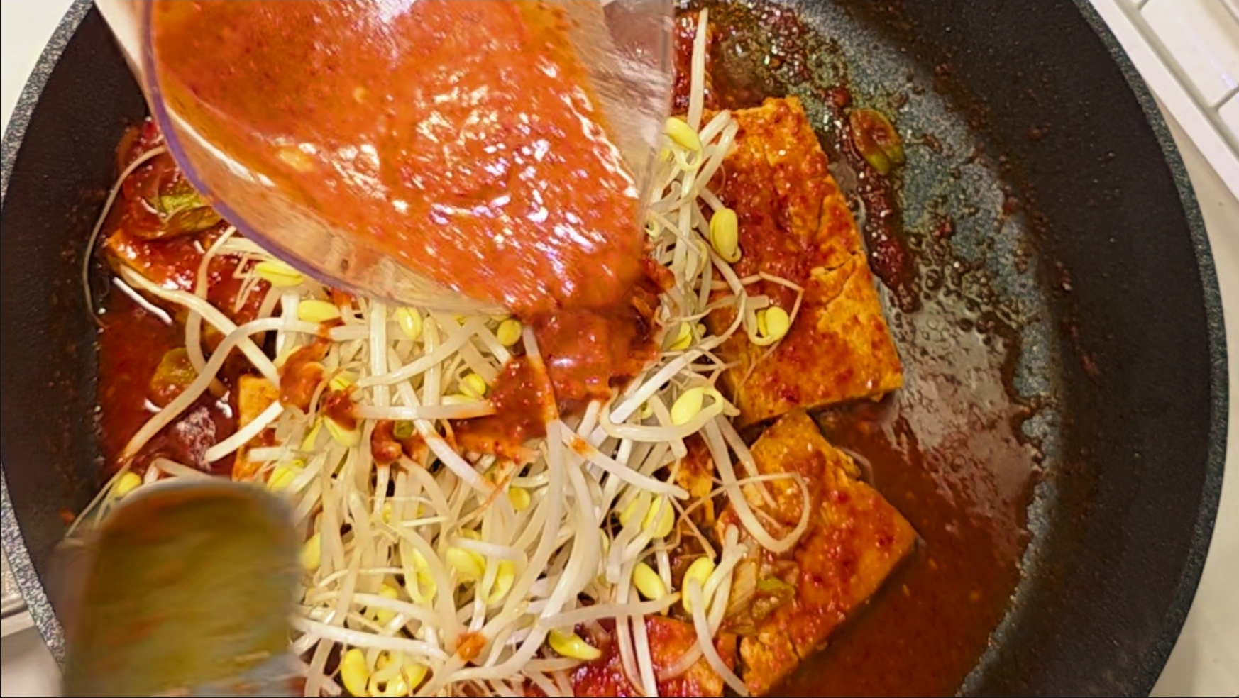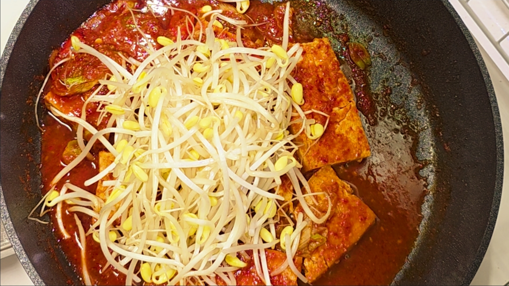 팬에 두부를 부쳐 양념조림을 하고, 그 두부조림 위에 콩나물등을 얹어