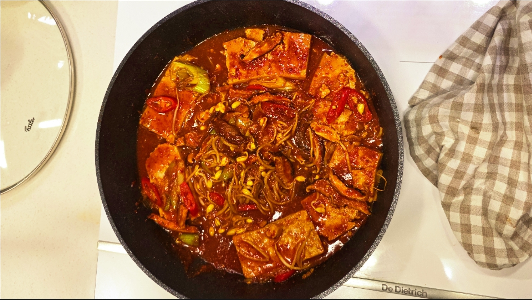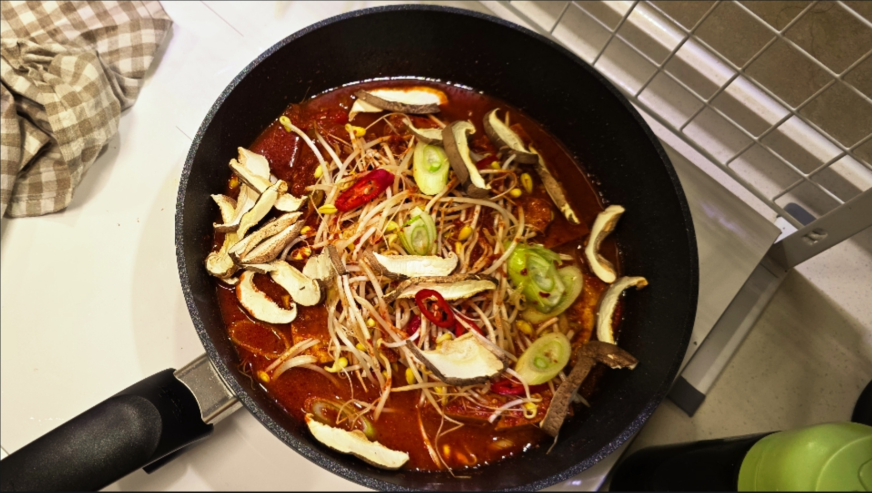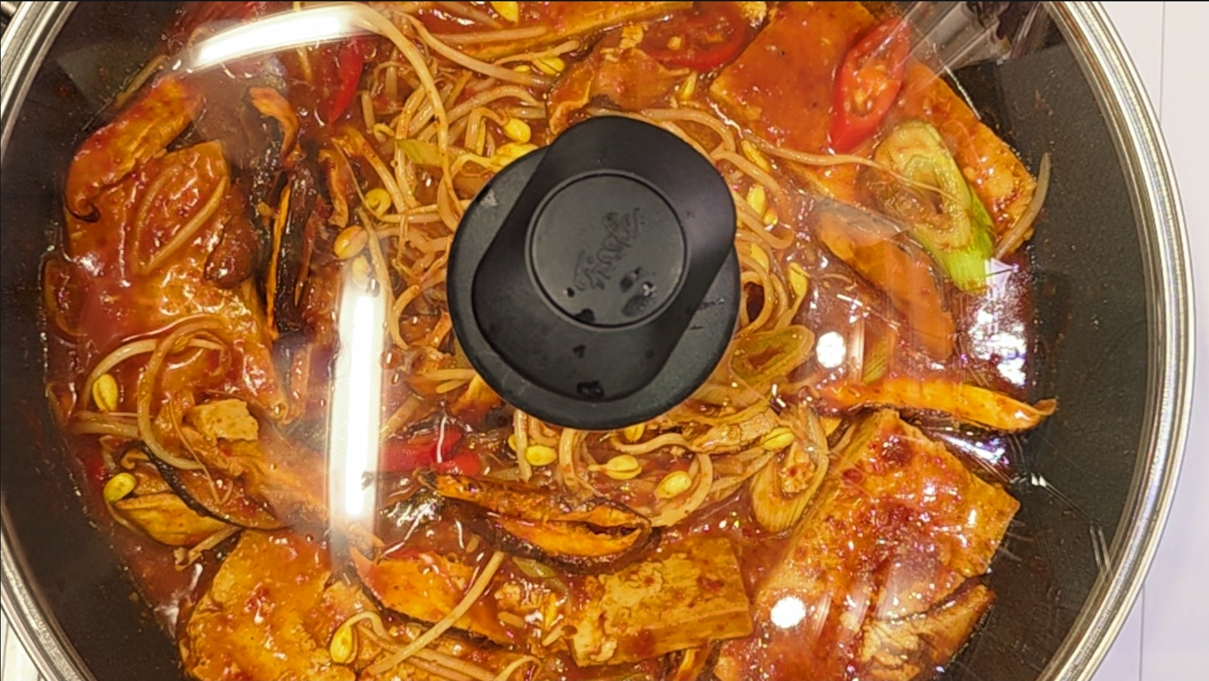 2. 썰어놓은 대파와 홍고추를 반씩 넣고 뚜껑을 덮고 중불로 30초 끓이다가 팬을 들어 앞뒤로 흔들어 주세요.