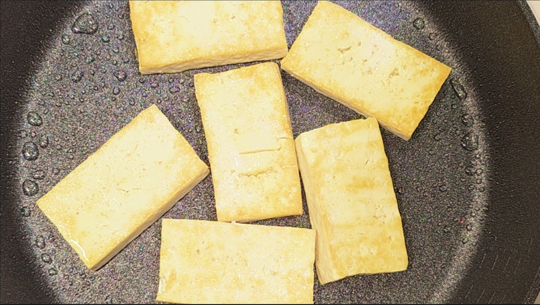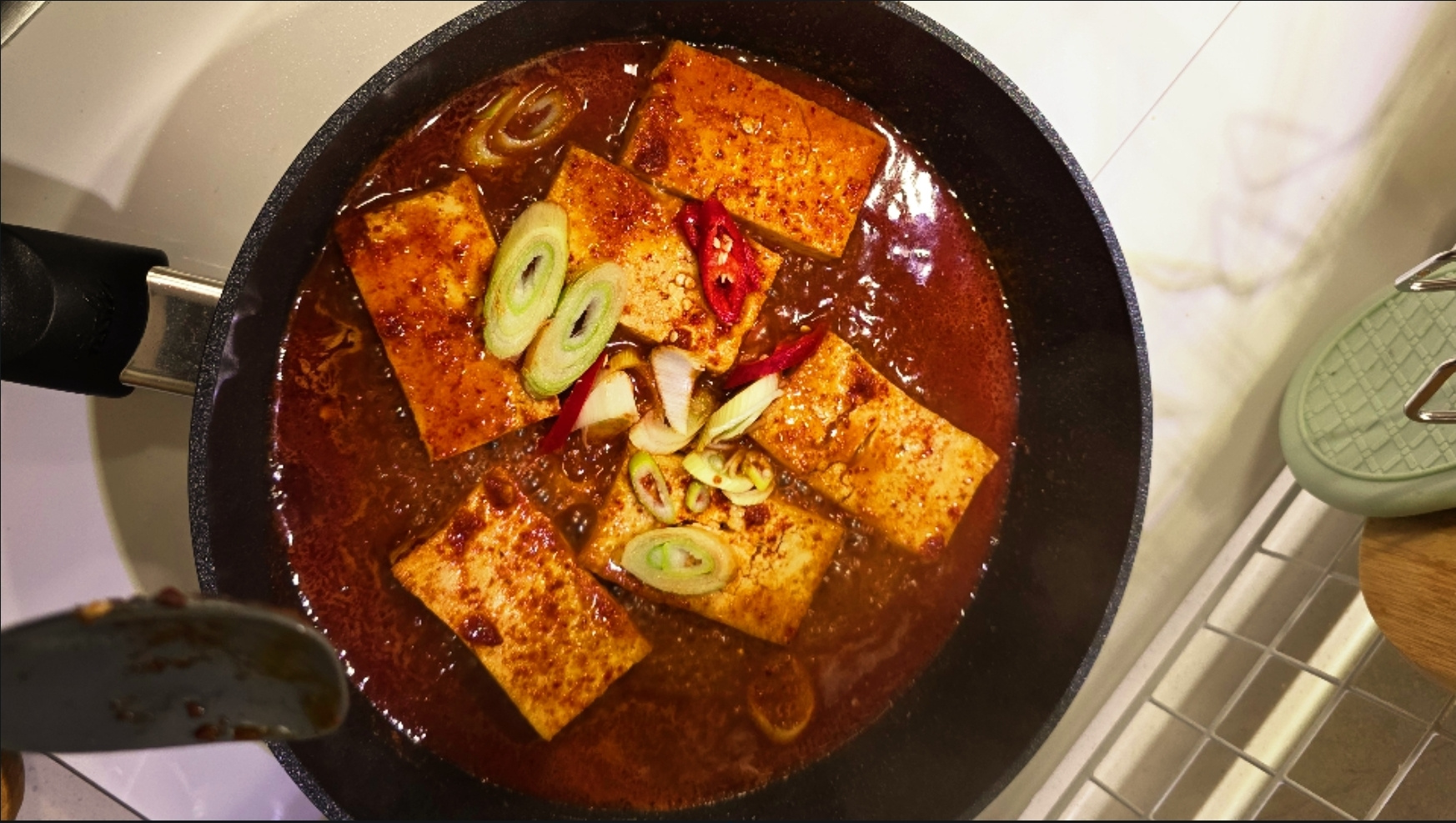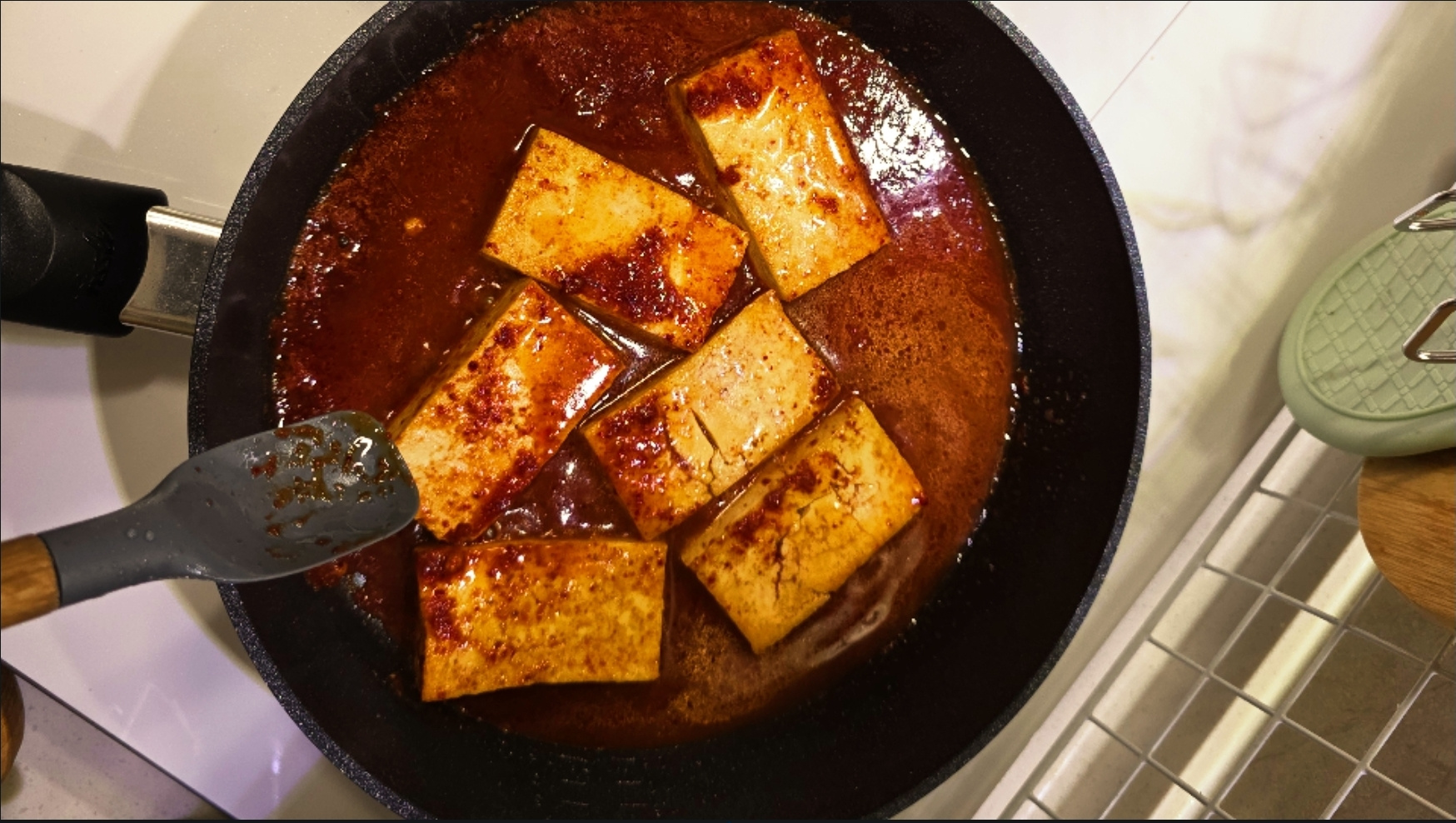1.불을 끄고, 두부가 팬에 달라 붙지 않도록 팬을 들어 앞뒤로 한번 흔들어 주세요.