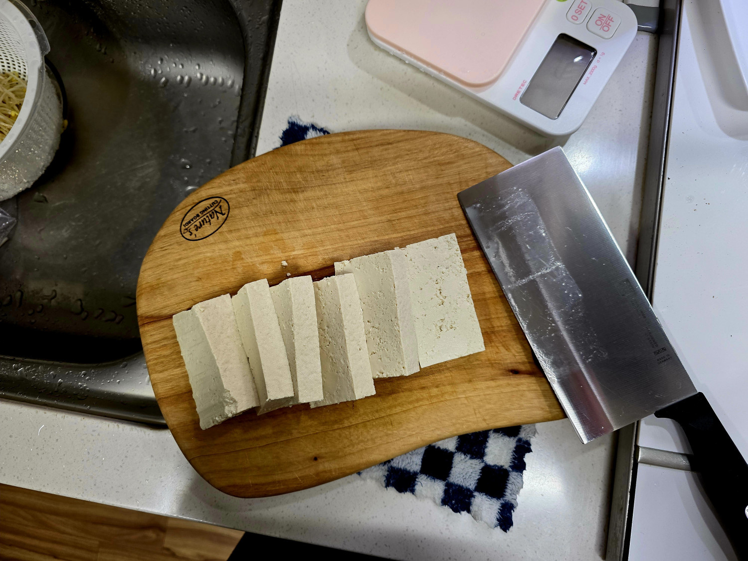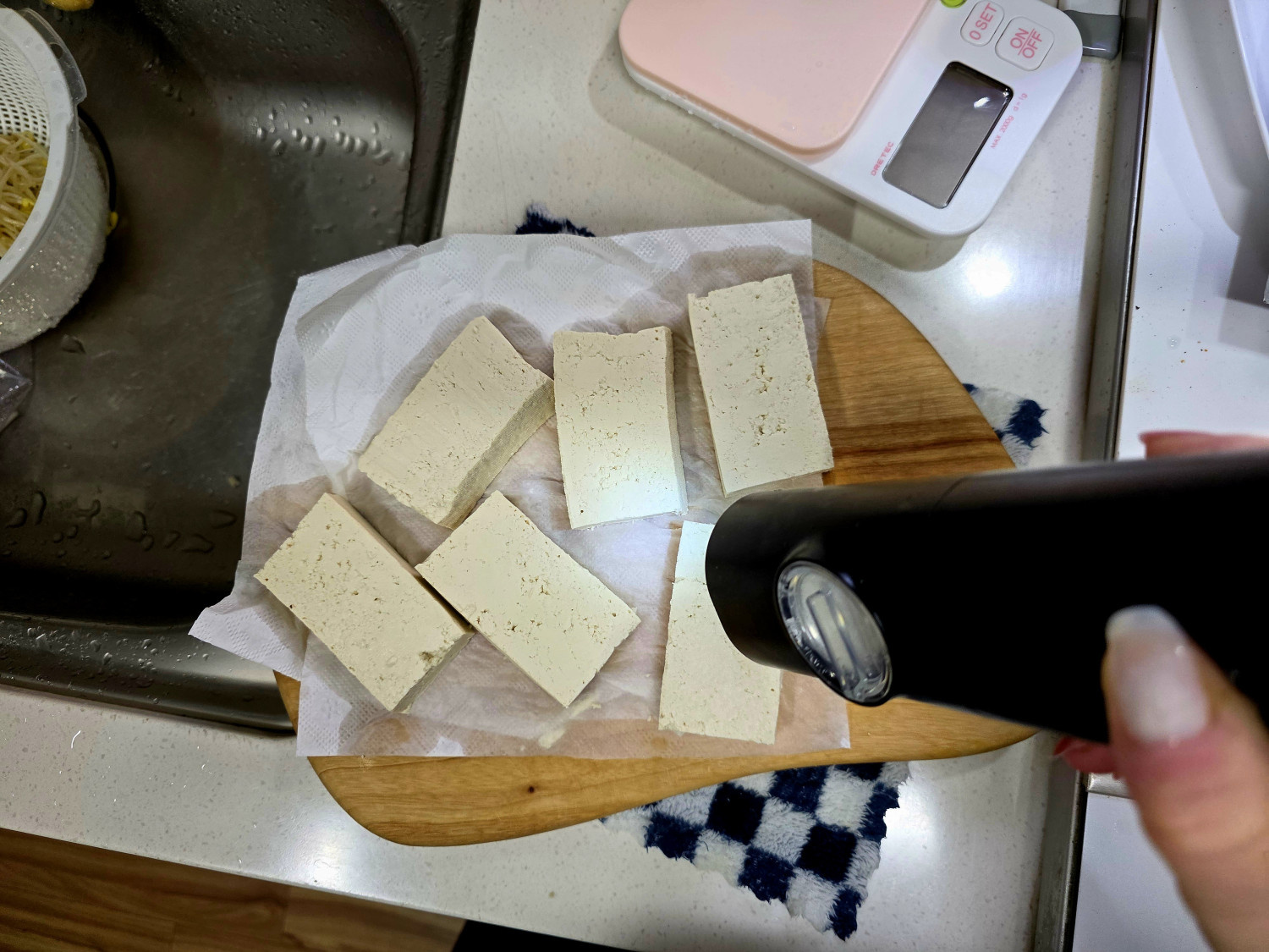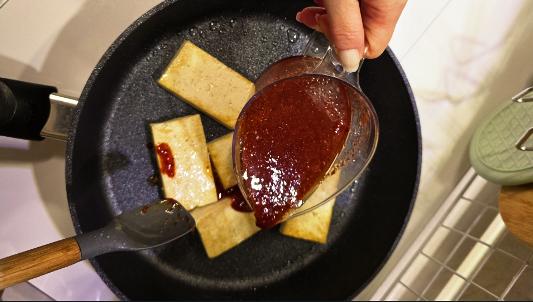 1.불을 끄고, 두부가 팬에 달라 붙지 않도록 팬을 들어 앞뒤로 한번 흔들어 주세요.