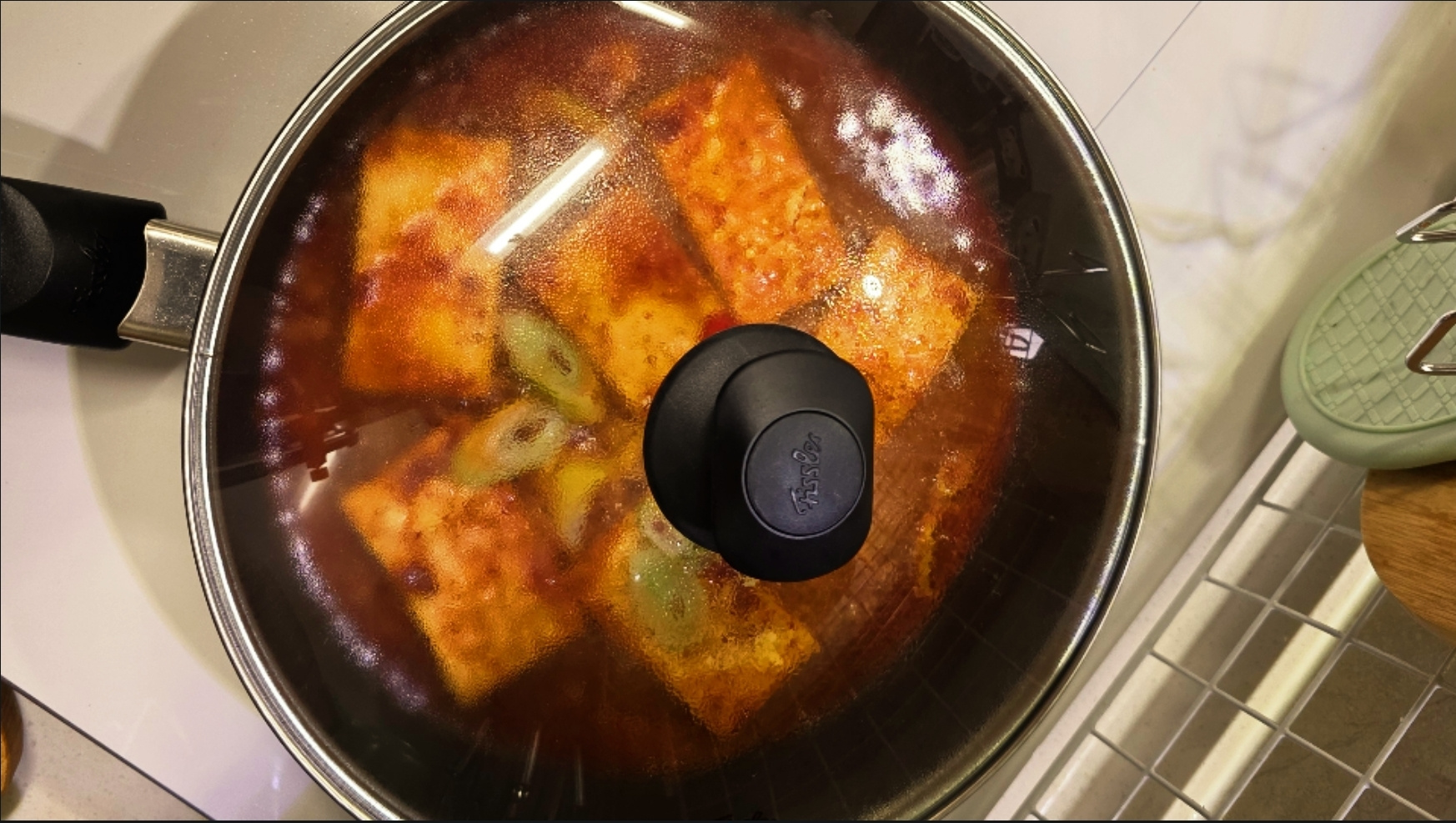 1. 노릇노릇 부친 두부에 양념장 반을 붓고 물 100ml를 부어 주세요