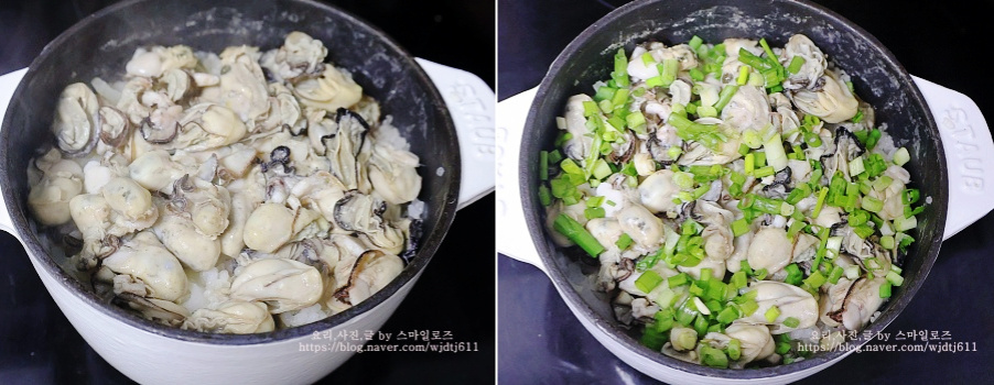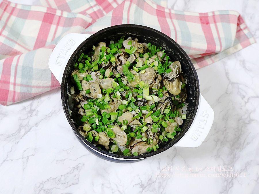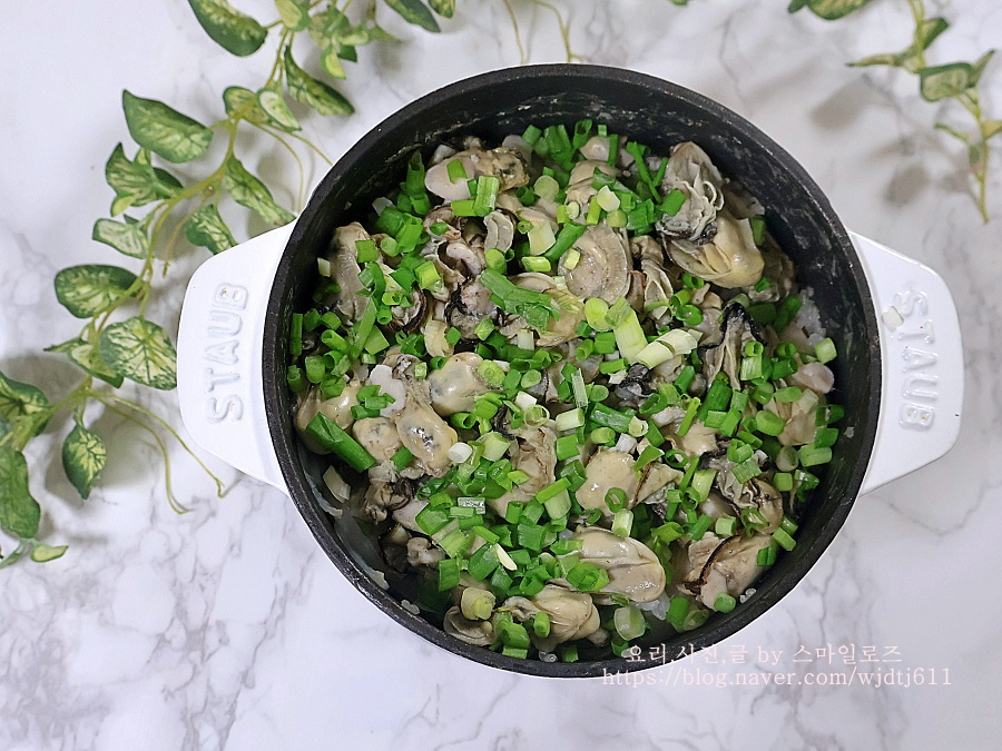 완성된 굴밥 위에 쪽파를 솔솔 뿌려주면 굴솥밥 무 굴밥 완성입니다