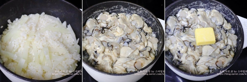 그리고 굴을 올려주고 버터 한쪽을 올려주고 뚜껑 덮어 약불에서 10분 정도 끓이다가