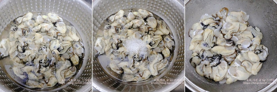 굴을 손질할 때는 바닷물까지 넣고 굵은소금을 넣어 손질하는데