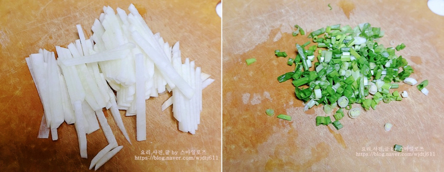 무를 채 썰어주고 쪽파도 송송 썰어줍니다