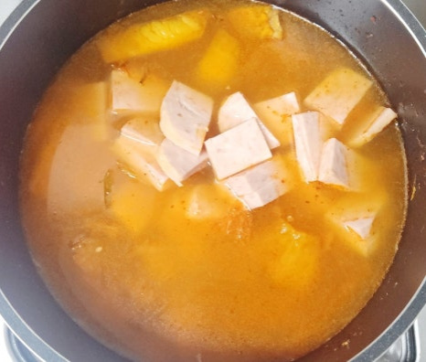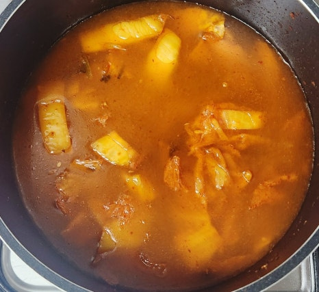김치가 충분히 볶아졌다면 물 900ml를 넣고 썰어놓은 스팸을 함께 넣어 주세요. 스팸은 국물을 끓일 때 미리 넣어주는 게 좋아요.