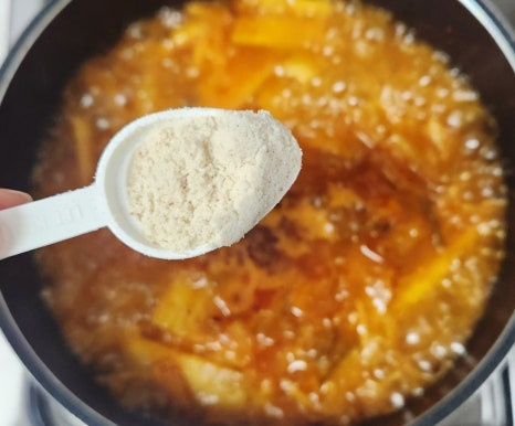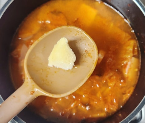 센 불에서 끓이면서 다진 마늘 1T를 넣고 중불로 낮춘 후 고춧가루 2T와 치킨스톡 1T를 넣어 주세요. 치킨스톡이 없으면 참치액이나 국간장으로 대체해도 좋아요.