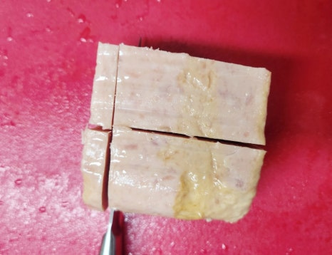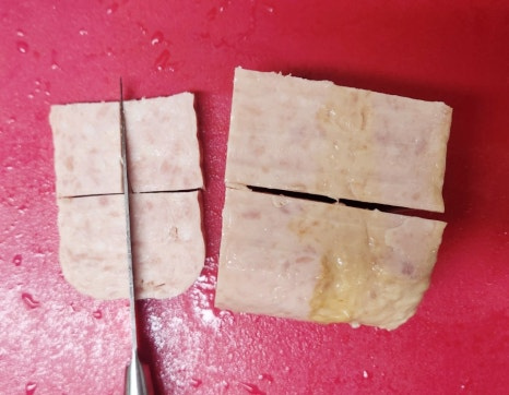 스팸 200g은 직사각형 모양으로 납작하게 썰어 준비합니다. 스팸은 너무 두껍지 않게 썰어야 김치와 함께 익을 때 간이 잘 배어요.