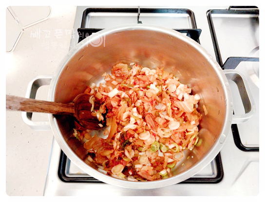 묵은 김치를 잘게 잘라 1 컵을 넣어 줍니다.