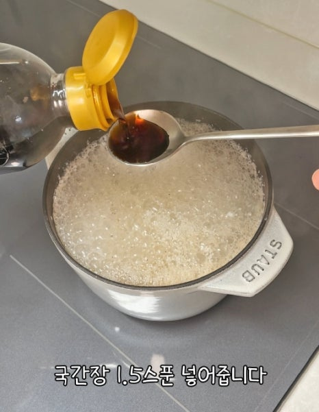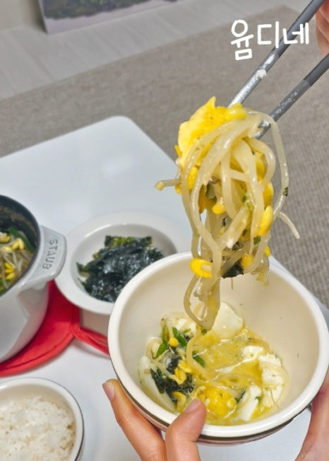 1. 반숙 계란 위에 콩나물과 국 3스푼!