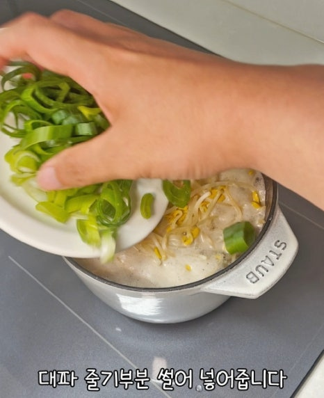 어느정도 콩나물이 익었다면 대파 줄기부분을 썰어서 넣어줍니다.