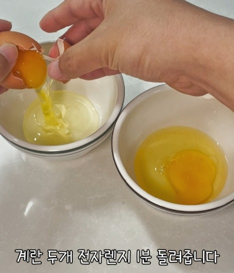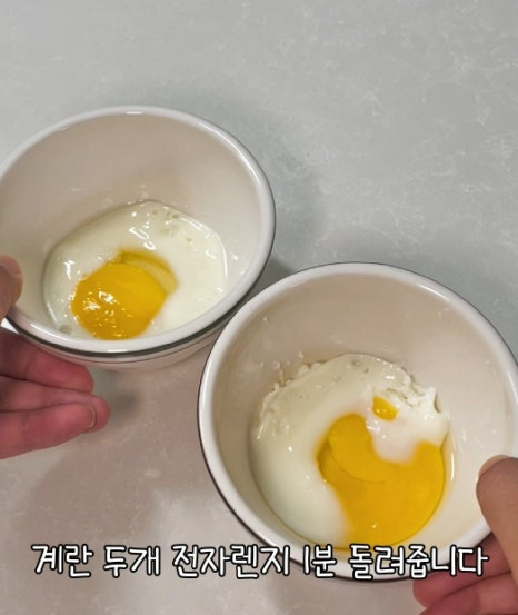 그릇당 계란 한개씩 넣고 전자렌지 1분 돌려줍니다.