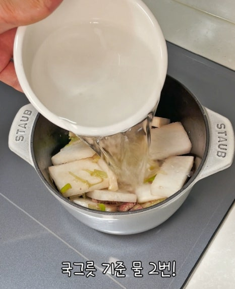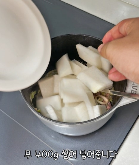 양지 150g , 무 400g , 대파 1/2대 , 다진마늘 1스푼 , 국간장 2스푼 , 액젓 2스푼 , 소금 약간 , 참기름 2스푼 , 물 국그릇 기준 2번 , 후추 약간
