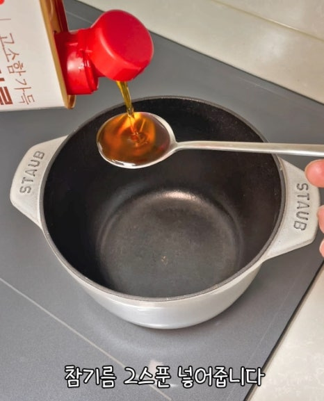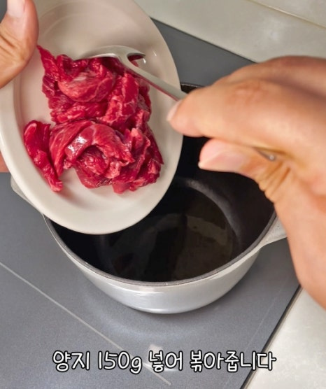먼저 냄비에 참기름 2스푼을 두르고 양지를 넣어 중불에서 볶아줍니다.