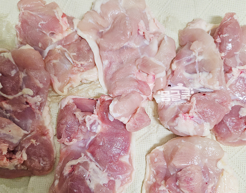 닭다리살을 찬물에 가볍게 헹군 뒤, 키친타월로 완전히 물기를 제거해 주세요.