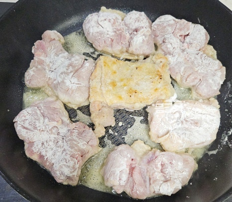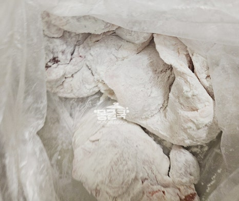 전분가루를 묻힌 후, 닭고기를 가볍게 탁탁 털어서 불필요한 여분 가루를 제거해주세요