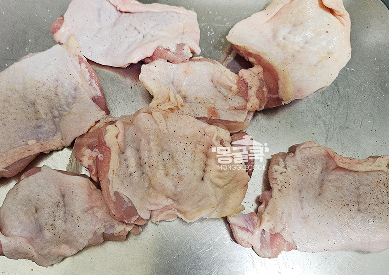 닭다리살에 소금과 후추를 앞 뒤로 골고루 뿌려 약 10분간 밑간해 두세요.