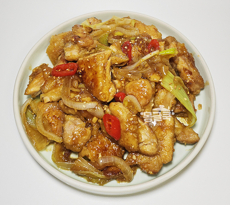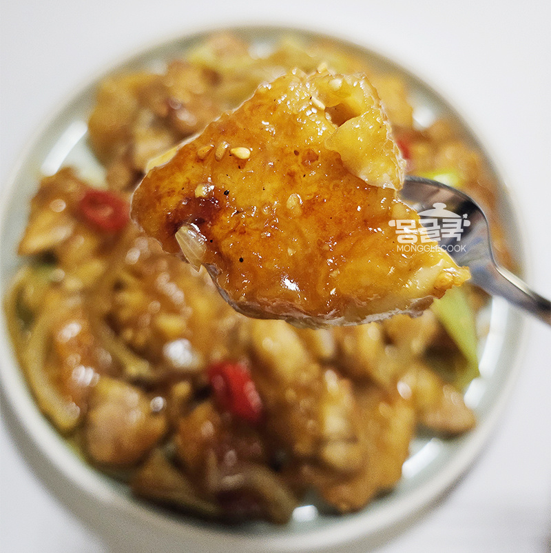 양념이 걸쭉해지고 닭다리살이 윤기 좌르르— 올라오면 완성!