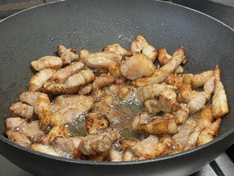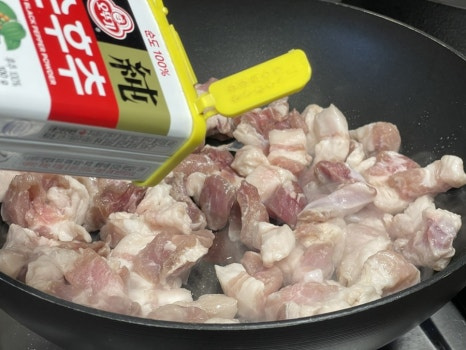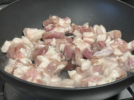 팬에 오일2T을 넣고 달궈 준 뒤 작게 썬 삼겹살을 넣고 중불에서 바삭하게 볶아 기름을 빼주세요.