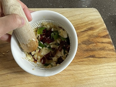 통마늘 5개와 청양고추1개 건고추1개는 작은 절구에 넣어 빻아 주세요.