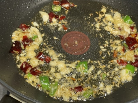삼겹살을 볶아 나온 기름에 미리 빻아 놓은 마늘, 고추를 모두 넣고 약불에서 볶아 주세요.