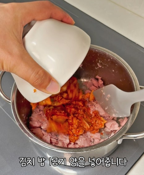 스팸 200g , 식용유 약간 , 김치 밥 한공기 분량 , 후추 약간 , 멸치액젓 1스푼 , 물 국그릇 기준 2번 , 국간장 1스푼
