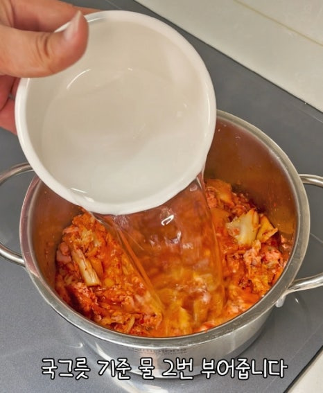 그다음 국그릇 기준 물 2번(약 600ml)을 붓고 센 불에서 끓이세요.