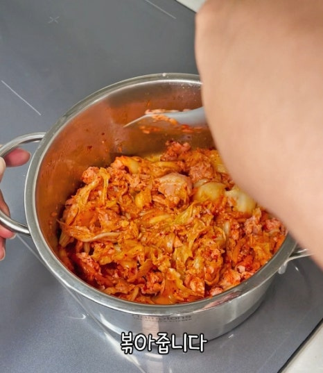 스팸이 노릇하게 익어갈 때 김치 한 공기 분량을 넣고 함께 볶습니다.
