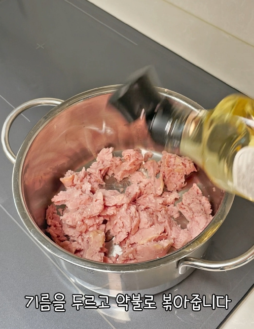 냄비에 식용유를 약간 두르고 중불에서 스팸을 먼저 볶아줍니다.