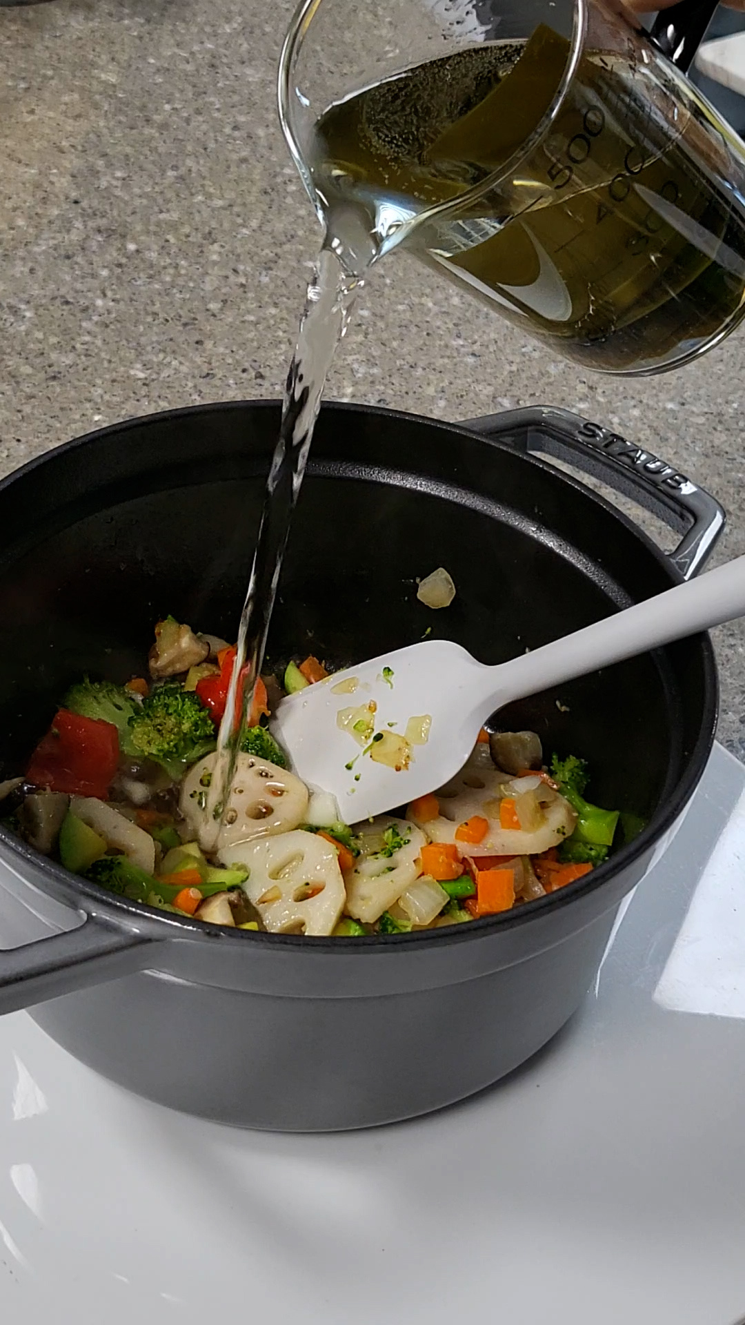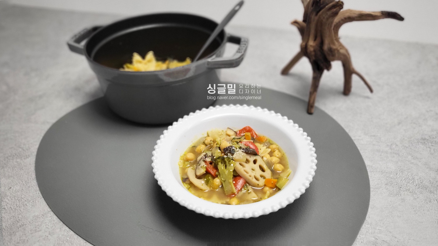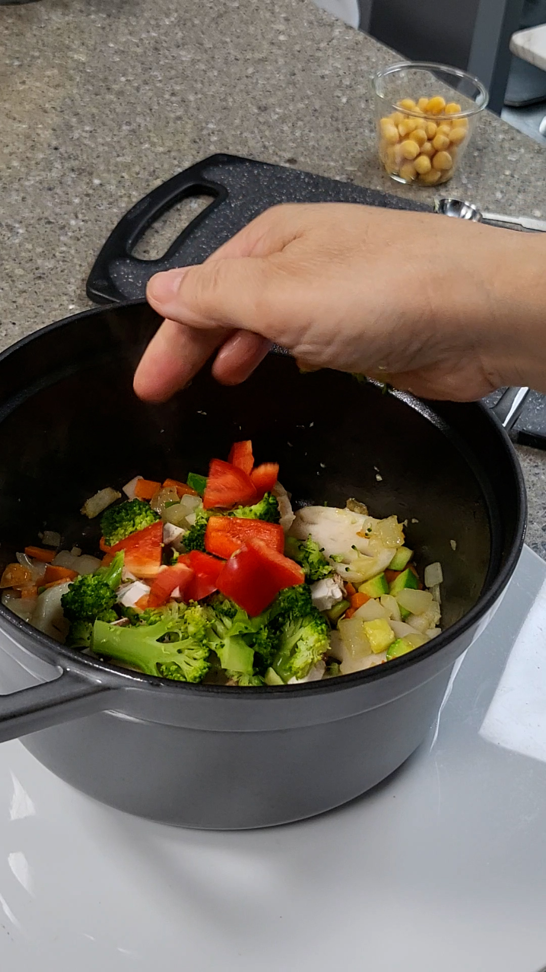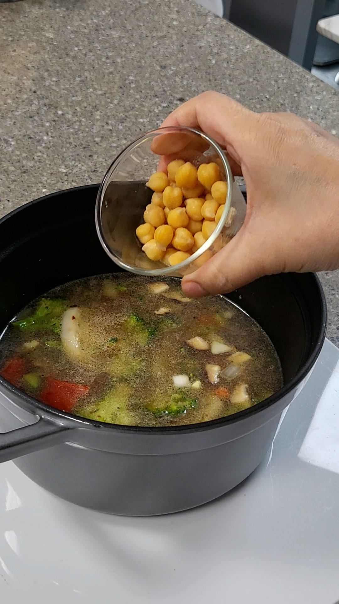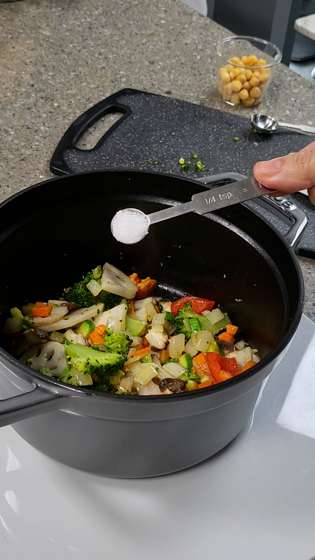 채소를 볶고나서 소금을 넣고, 다시마물, 삶은 병아리콩을 추가했다.
