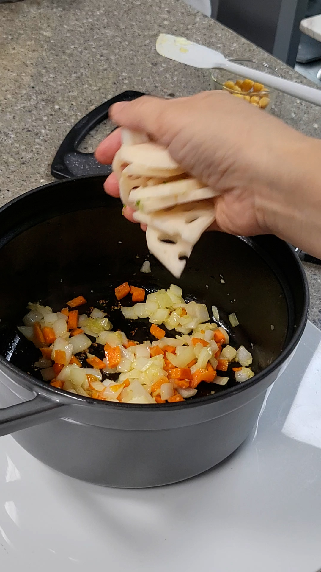나는 양파가 반투명해졌을 때 연근을 넣고,