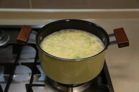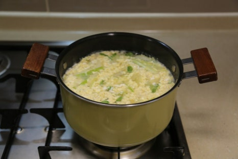 계란을 두른 후 끓으면서 넘칠수가 있으니 중불로 줄여주고 수저로 따로 저어주지 않는 다