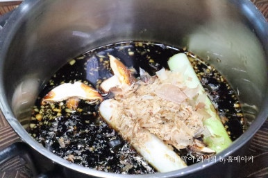 다시마 1장, 표고버섯 한 줌, 대파 흰 부분 1대, 가쓰오부시 한 줌