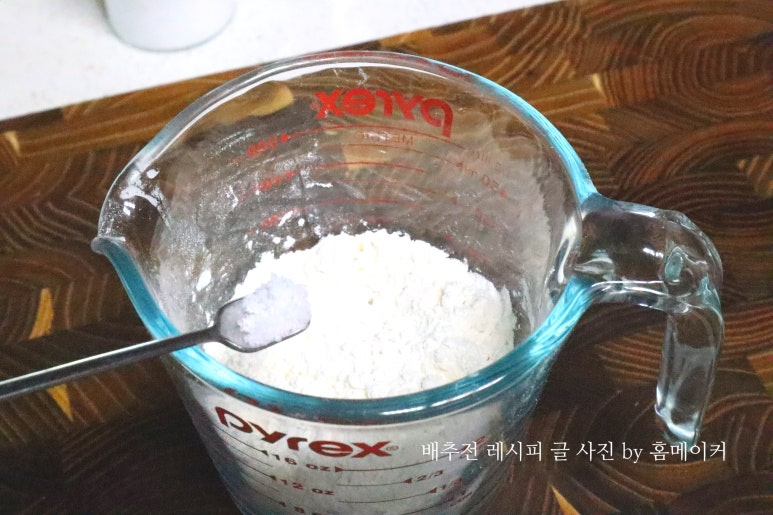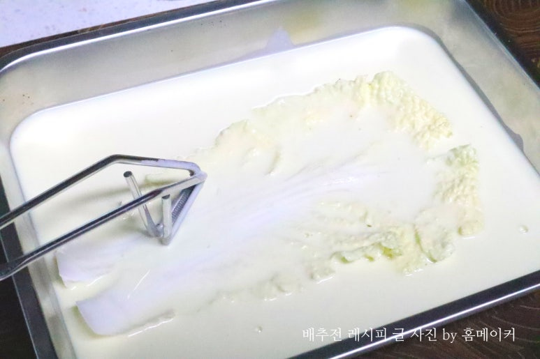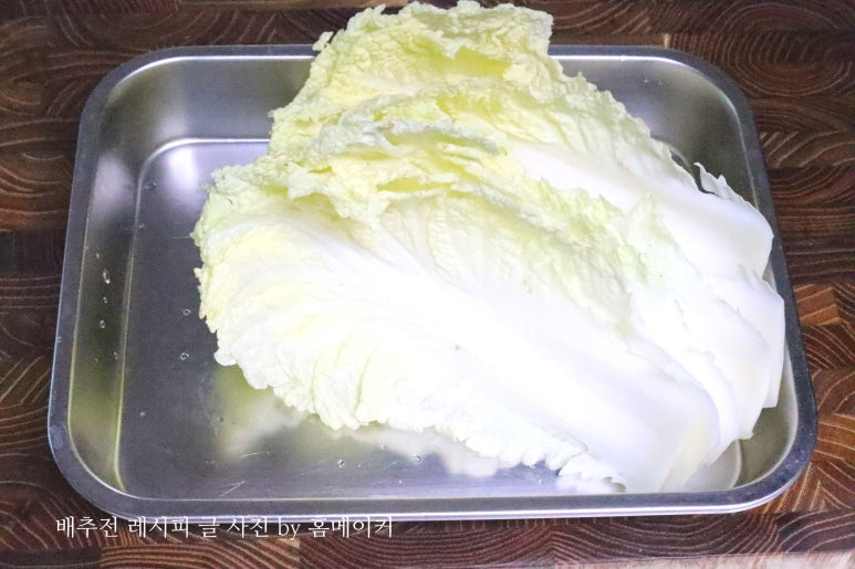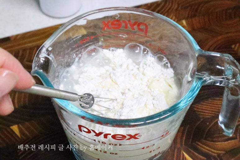 반죽물을 넓은 트레이에 부어서 배추에 반죽물을 가볍게 입혀 주세요.