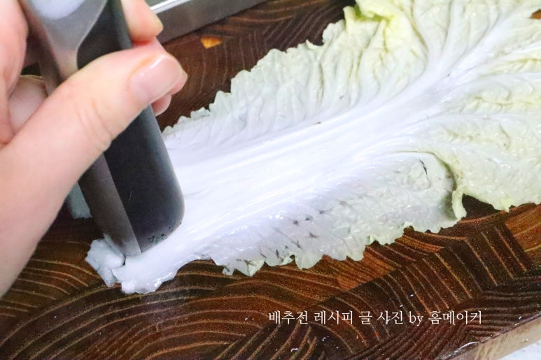 그다음 알배추의 줄기 부분을 칼이나 방망이 등으로 두드려 배추 심지를 부드럽게 만들고 배추를 펼쳐 줍니다.