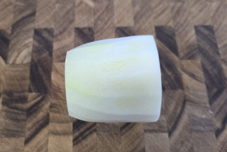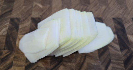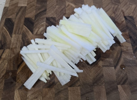 무는 동그랗게 자르지 말고 위 사진처럼 잘라 채 썰어 주세요.
