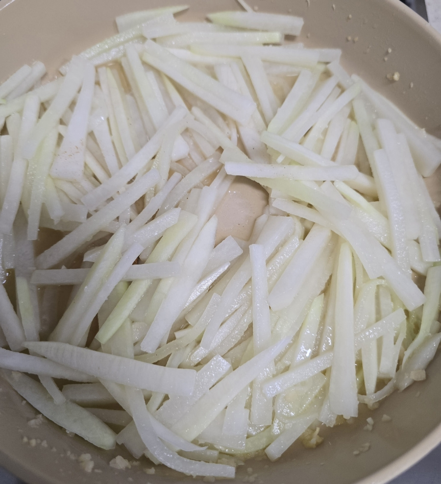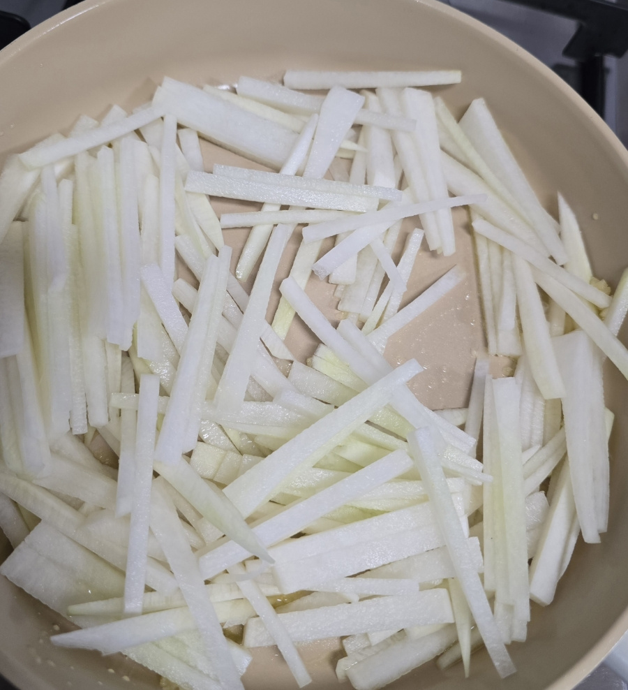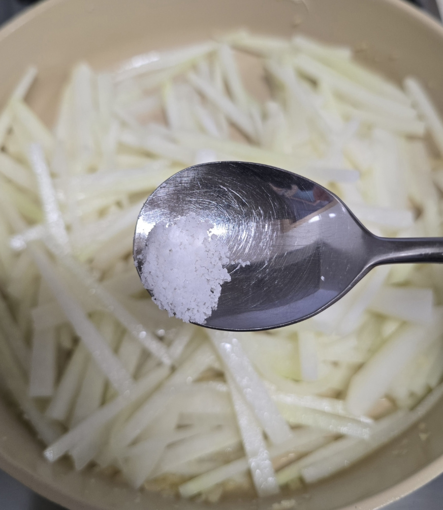 채 썬 무를 넣고 중불에서 투명해질 때까지 볶아줍니다.