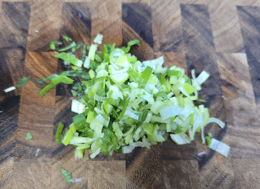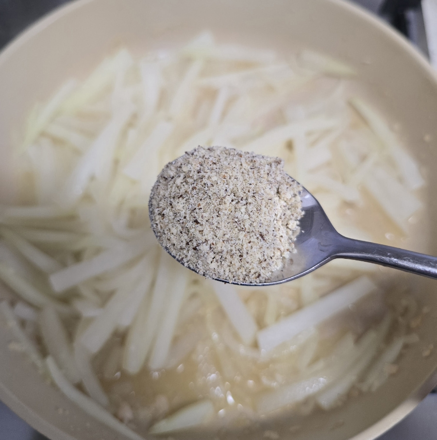 들깨가루 한 수저 넣고 빠르게 섞고 마지막으로 대파를 넣고 한 번 더 뒤적 가려준 다음 불을 꺼주세요.