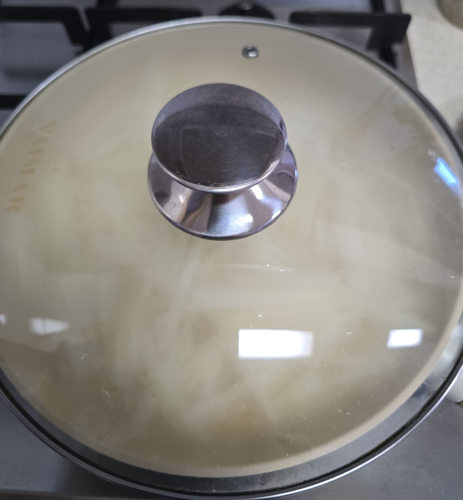 준비한 육수를 50ml 부어주고 뚜껑을 덮고 약불에서 5분 뭉근하게 익혀주세요.