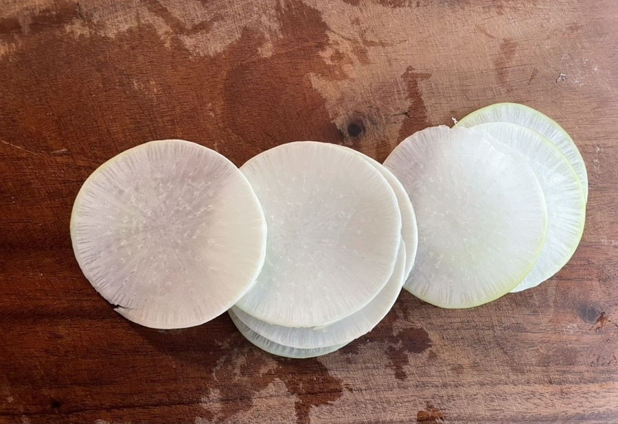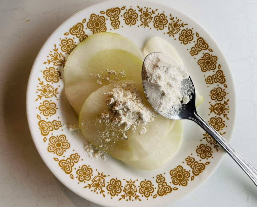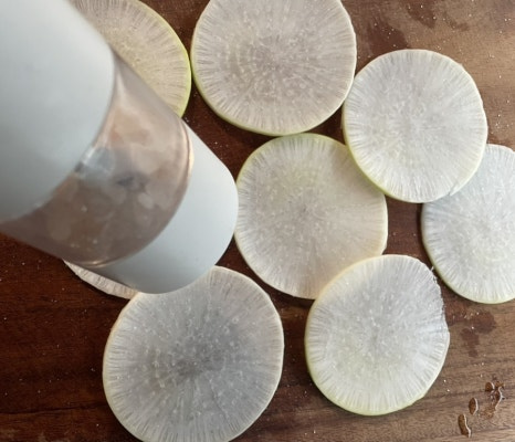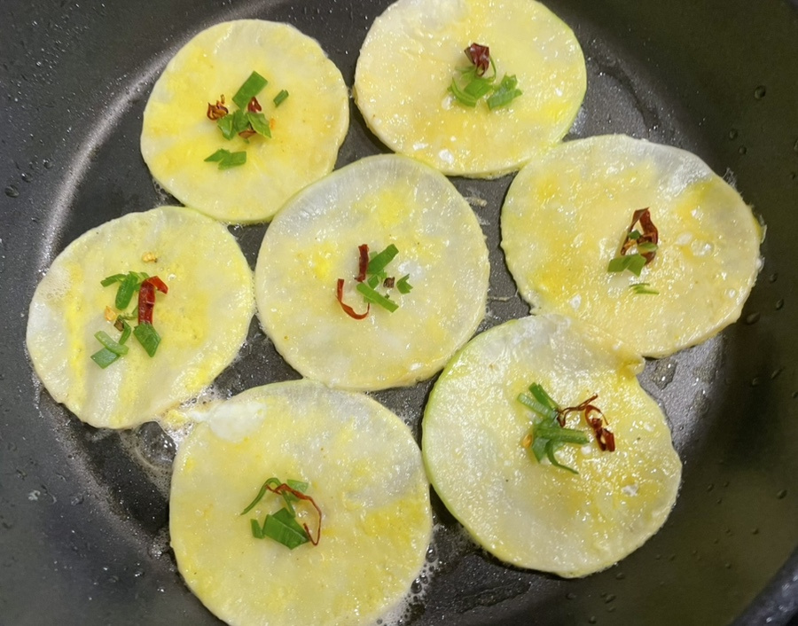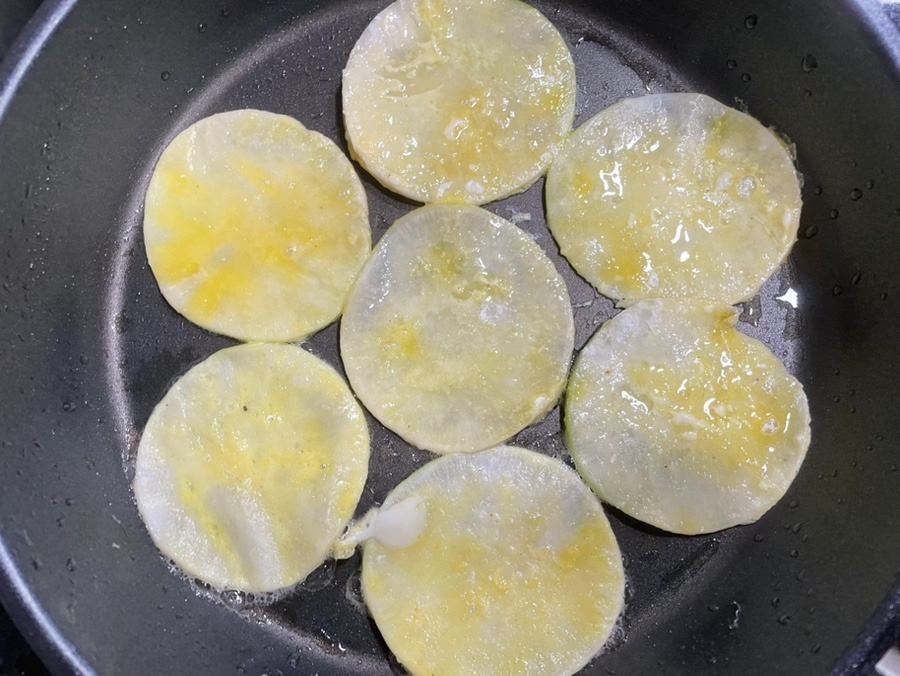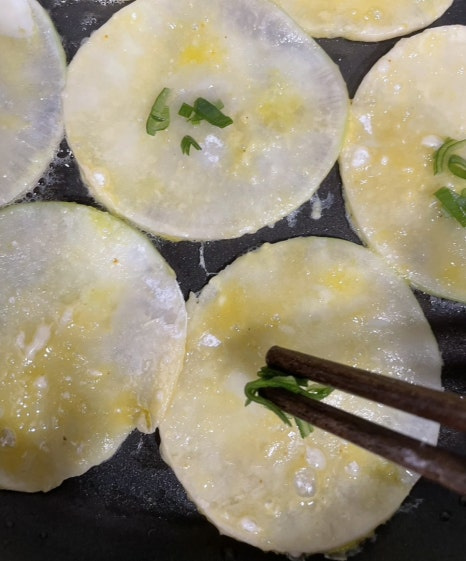 오늘 만드는 무전은 아주 아주 얇게 동그랗게 썰어서,소금에 살짝 절여 준 다음 물기를 꼭 짜서 무전을 부쳐 내니 쫄깃하면서도 아삭한 식감을 동시에 느낄 수 있어요.