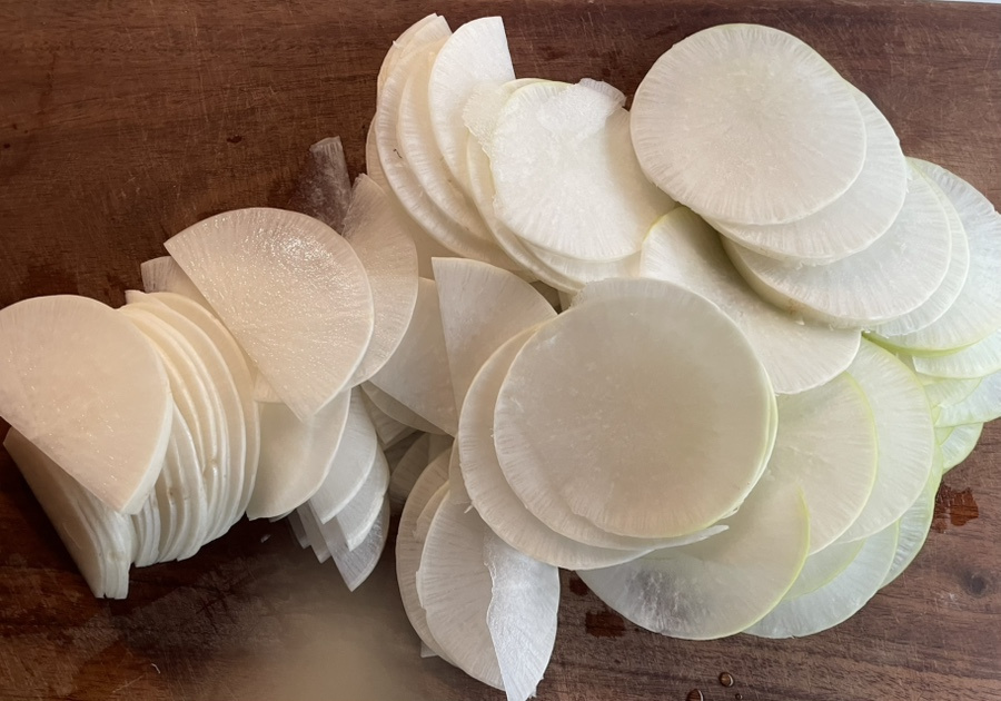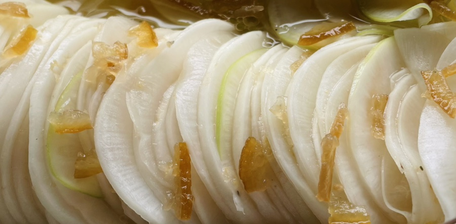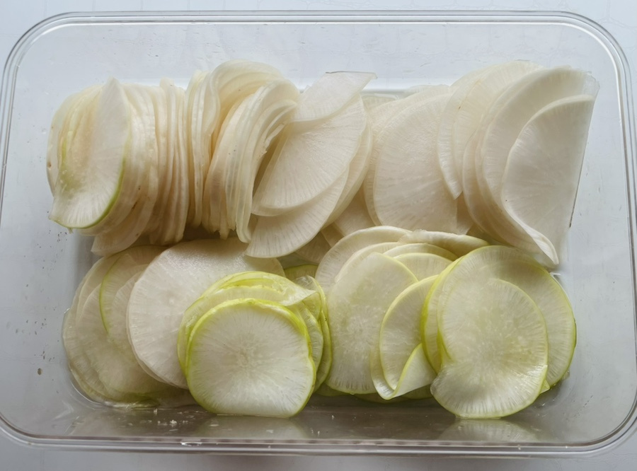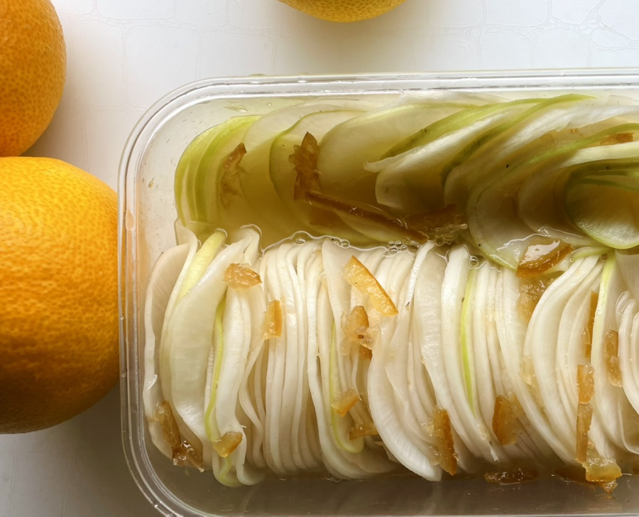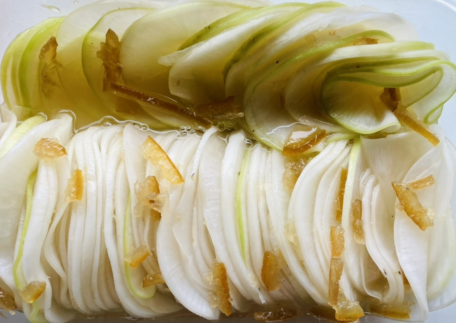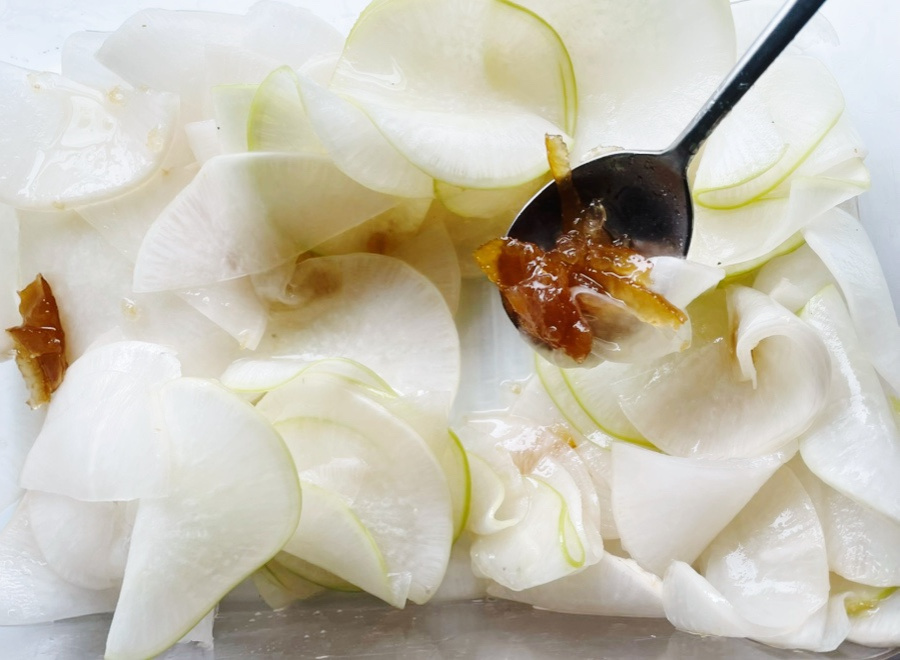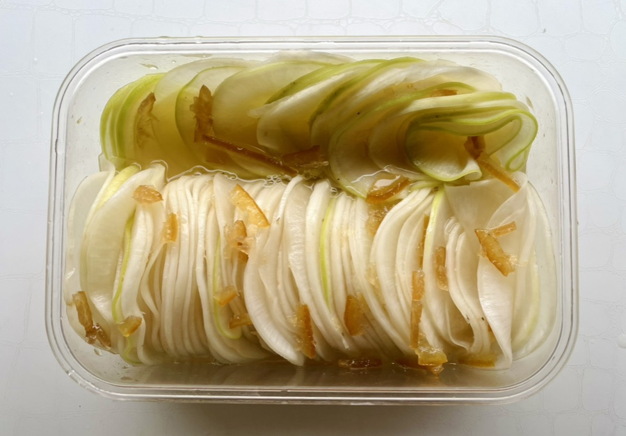 일식 스타일 반찬인데 얇게 썬 무를 살짝 절여서 약간 꼬들한 식감도 나고 마지막엔 입안에 유자향이 기분좋게 감돌아요.